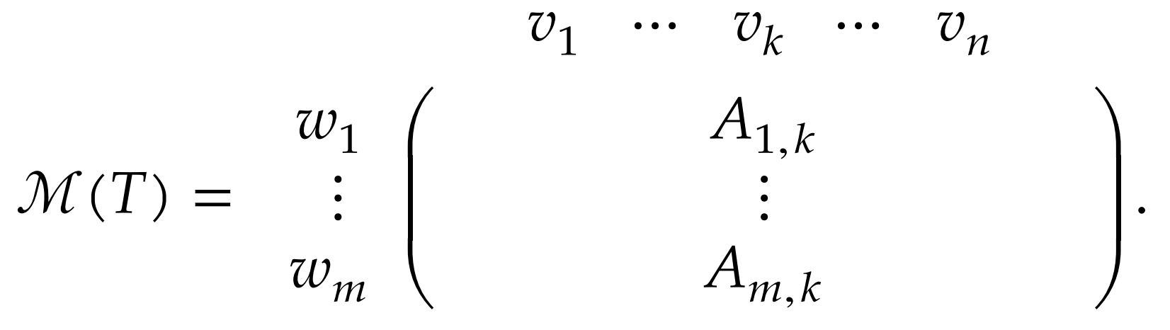 For any where is the basis of and is the basis of . The matrix of with respect to these basis is the -by- matrix whose entries are defined by If the basis are not clear from context, we use notation