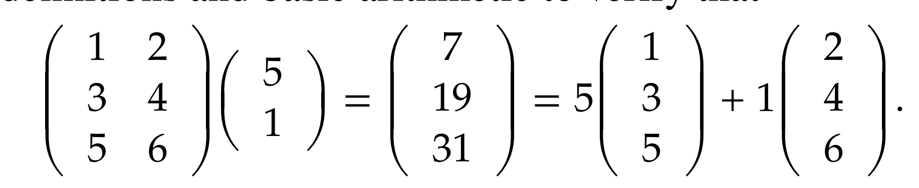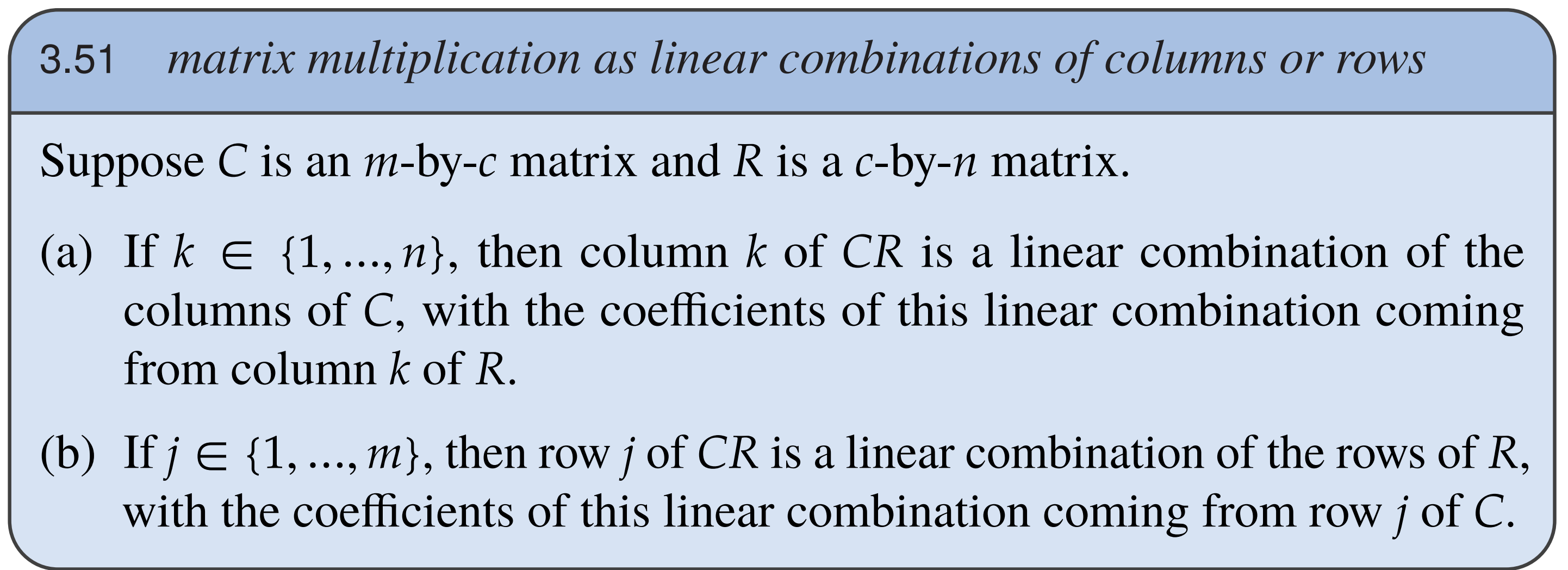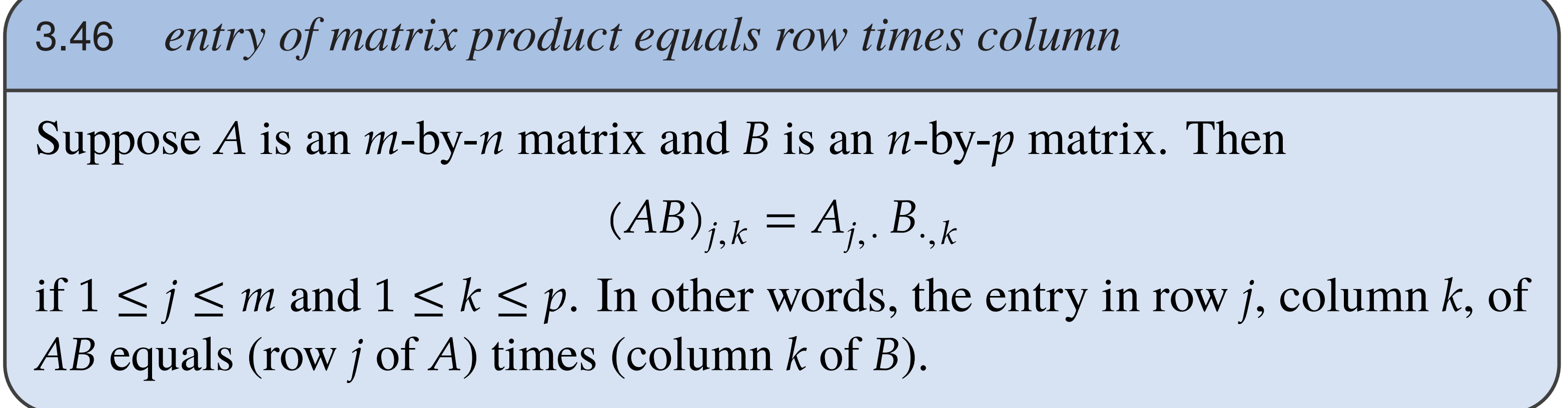 Created to make sure multiplication of linear maps holds. You take the row, column of the product and multiply the respective row and collum, with row from the first matrix and colum from the second. You can only multiply if the columns from the first match the rows from the second (inside numbers match.)