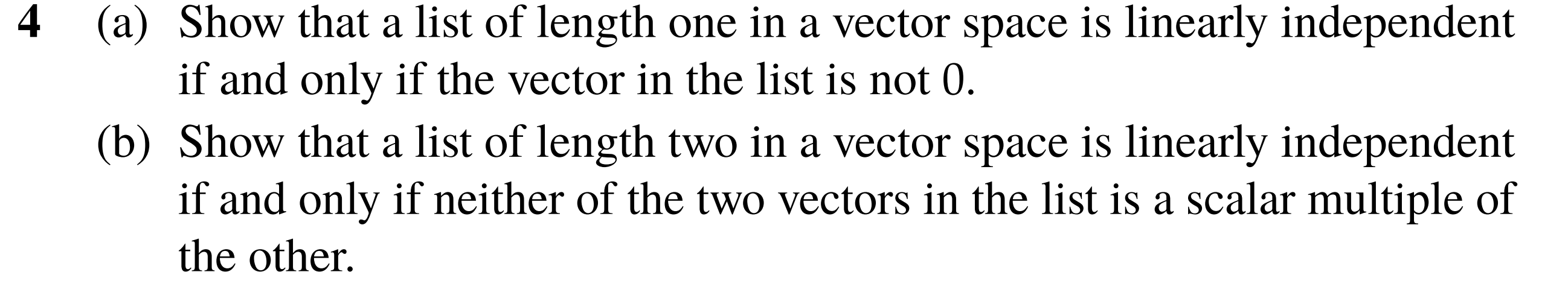 - A list of length two in a vector space is linearly independent neither of the two vectors in the list is a scalar multiple of the other.