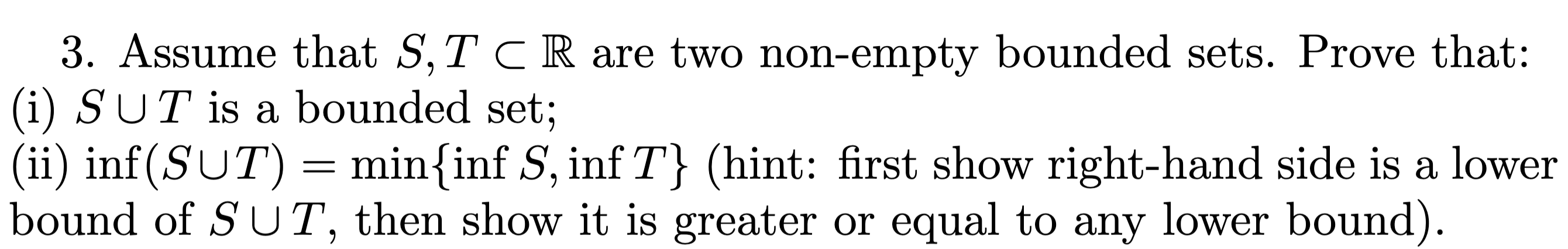 - As both the previous sets are bounded, let be and respectively. Then, w.l.o.g assume . With this, it stands that will also be an upper bound of as it is larger than any element in that set. Taking any element , either or . Then, if we have it so . If , we have it so , thus it is bounded by . Use the same logic for infimum.