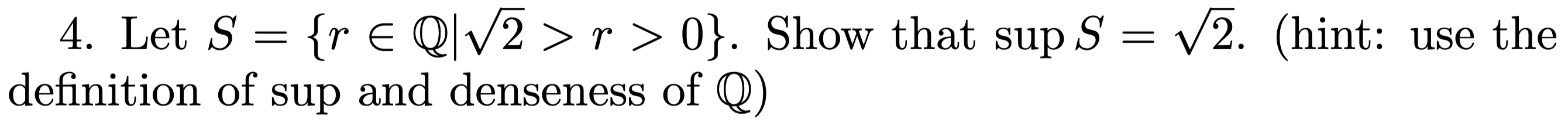 - Firstly, notice that is an upper bound, by definition. Now, for the sake of contradiction, assume there is another upper bound . Then, by the density of , since both and are real numbers, there exists a rational between and serving as a contradiction for being an upper bound.